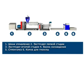 - • Линии гранулирования воздушного охлаждения. Нарезка гранул осуществляется сразу после экструдирования посредством вращающего ножа. Вентилятор выполняет обдув гранул, охлаждая их.