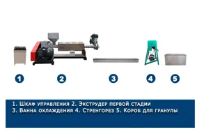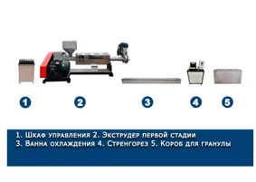 - • Стренги подаются в ванну охлаждения, а затем затягиваются в устройство нарезки. Также процесс грануляции может предусматривать другой способ формирования гранул, если имеет устройство водокольцевой резки. В этом случае сырьё нарезается, будучи ещё горячим и одновременно охлаждается.
